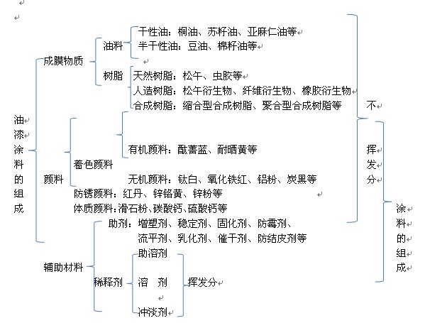 涂料的組成如下表所示。從表的左邊看,涂料由成膜物質(zhì)、顏料和輔助材料三部分組成。從表的右邊看,涂料由揮發(fā)分與不揮發(fā)分兩部分組成。上述情況并非矛盾。因為輔助材料里面有不揮發(fā)的固化劑、防霉劑等,同時也有屬于揮發(fā)分的稀釋劑等。